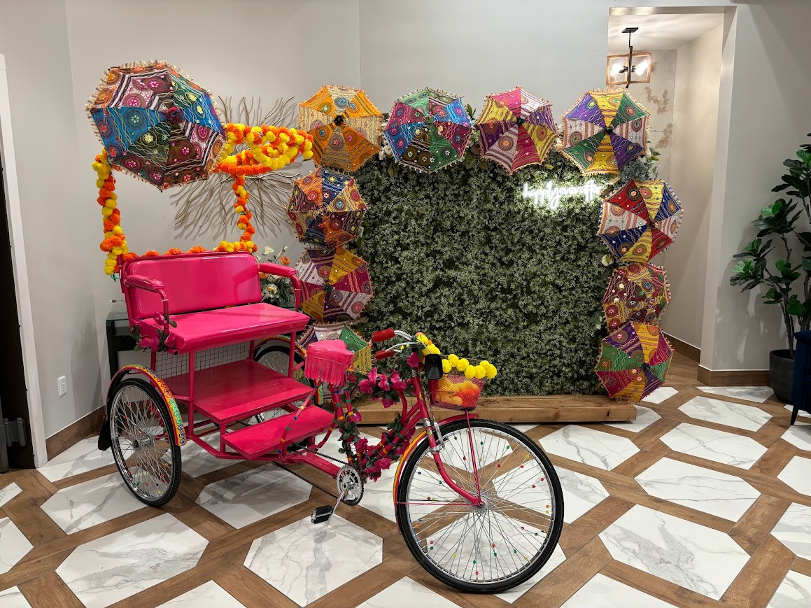 A vibrant cycle rickshaw adorned with cascading flowers, its wheels spinning with anticipation as it waits to whisk away the newlyweds on a whimsical journey. The rhythmic clang of its bell fills the air, echoing the excitement of the festivities. And not far behind, a retro Bajaj scooter, polished to perfection, revs with nostalgic charm, ready to transport the couple into their next chapter of adventure and love. These iconic wedding props inject a dose of flair and personality into the celebration, promising unforgettable moments and timeless memories for all who witness their joyful ride.